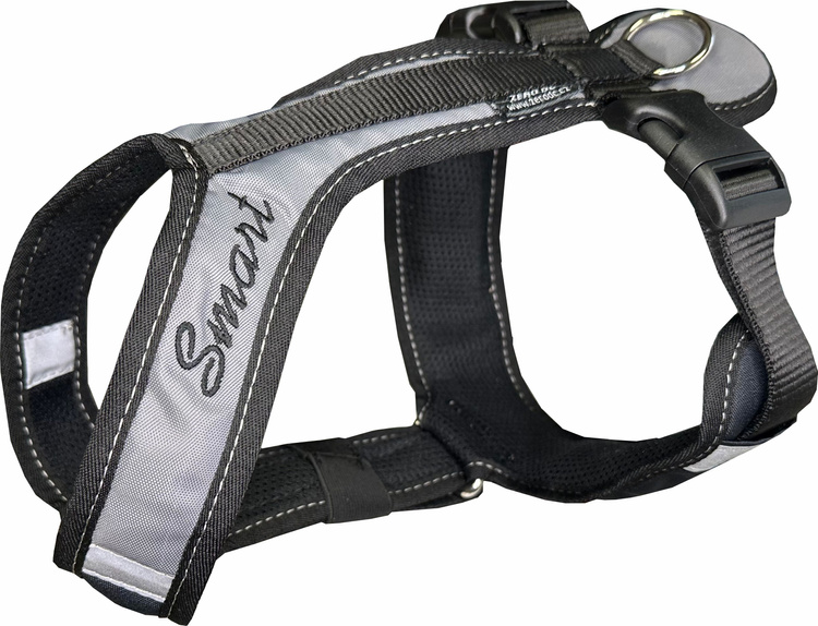 Kolory są zawsze kombinacją szarości, a haftowana naszywka na szyi nadaje uprzęży ekskluzywny wygląd. Posiada również paski odblaskowe, które zapewniają psu bezpieczeństwo.