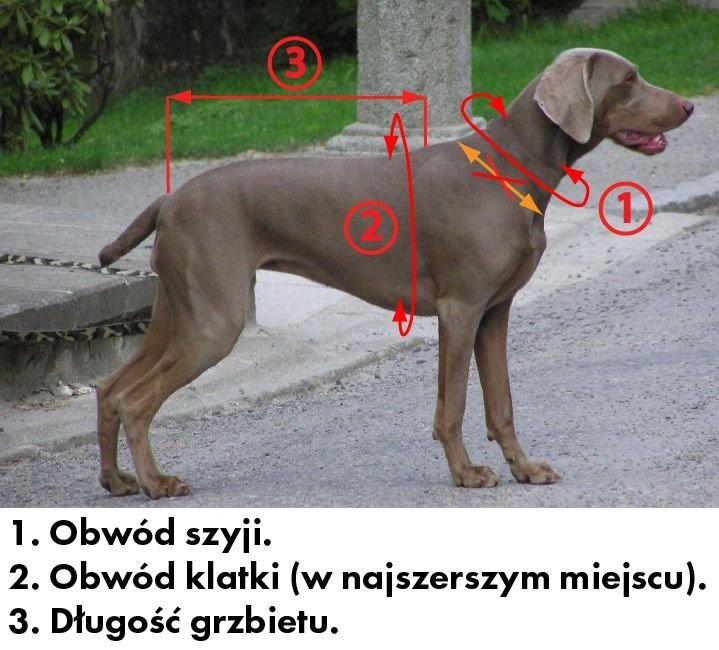 Rozmiar Obwód szyi (cm) Obwód klatki piersiowej w najszerszym miejscu (cm) Długość od kłębu do ogona (cm)